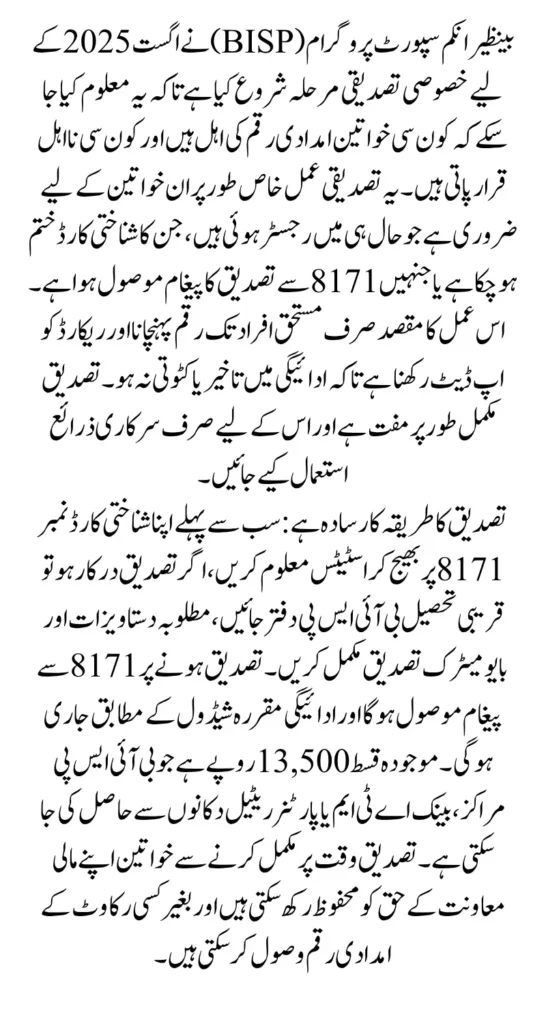 BISP 8171 Verification November 2025 to Identify Eligible and Ineligible Women for Payments. The BISP 8171 November 2025 Verification is a key process to ensure that financial aid continues to reach the most deserving low-income families in Pakistan. This year, the verification drive focuses on identifying women who are eligible to receive Rs. 13,500 payments and those who no longer qualify.